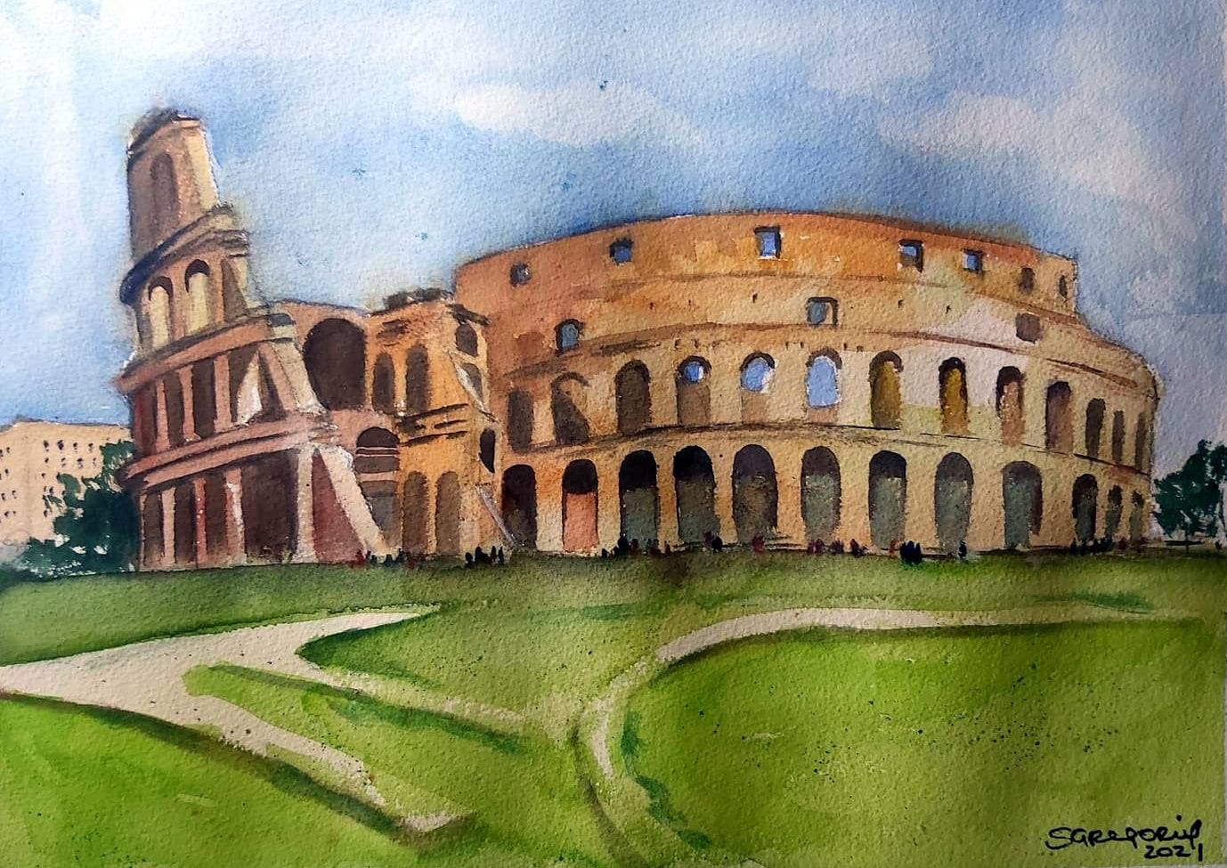 Description: The famous Colosseum in Rome, Italy. This was painted during an online lesson in the Coronavirus pandemic.